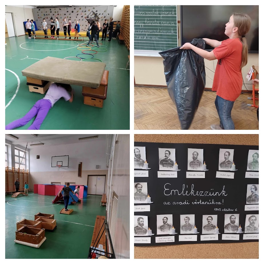 Az aradi vértanúk tiszteletére rendeztünk akadályversenyt pénteken. Az alsósok 6 állomáson tehették próbára tudásukat és ügyességüket. A program zárásaként egy közös plakátot készítettek az állomásokon szerzett jutalmakból.