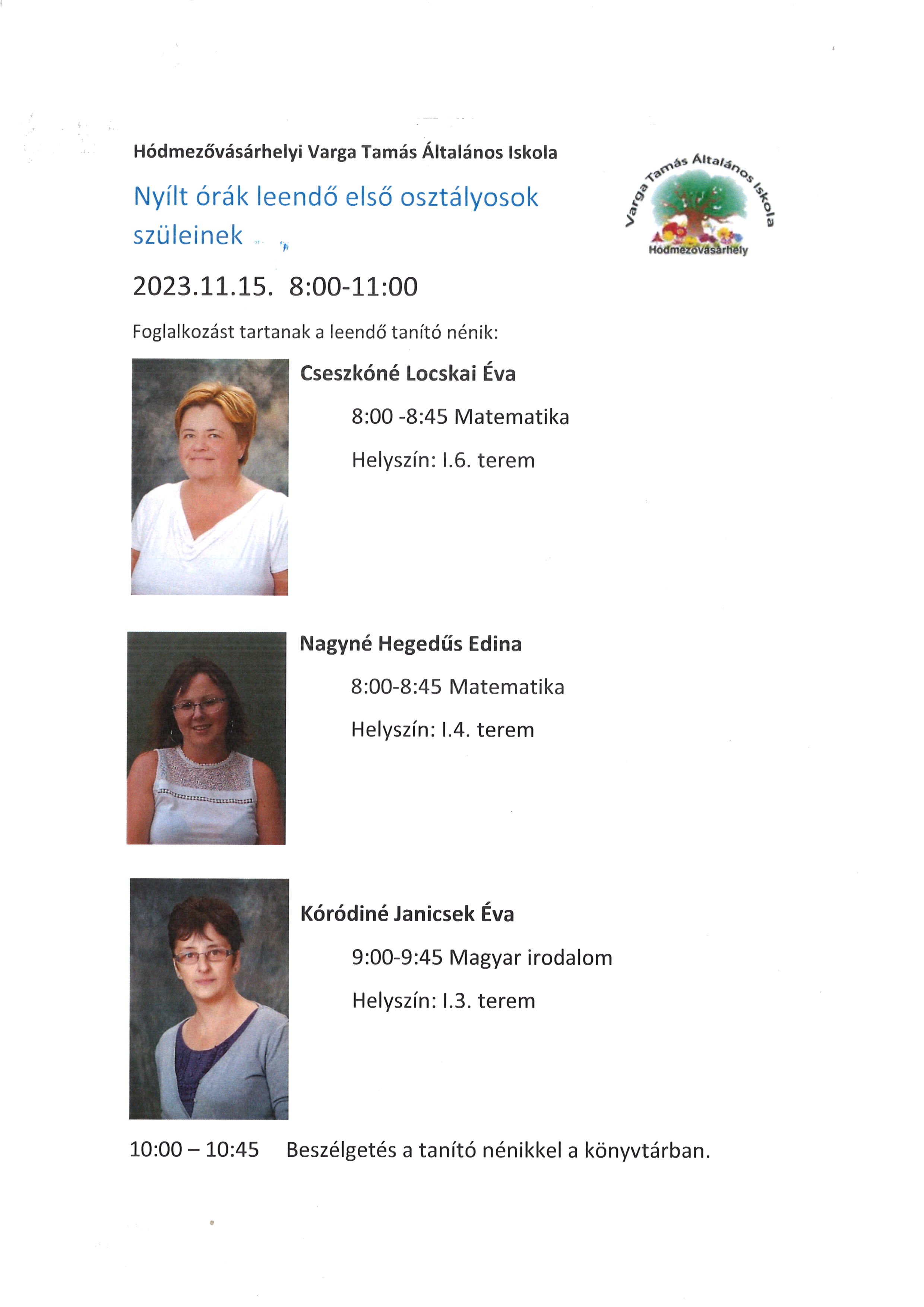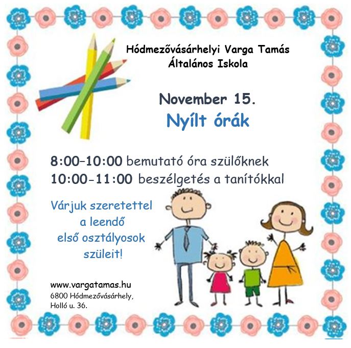 Szeretettel várjuk a leendő első osztályosok szüleit nyílt óráinkra november 15-én.