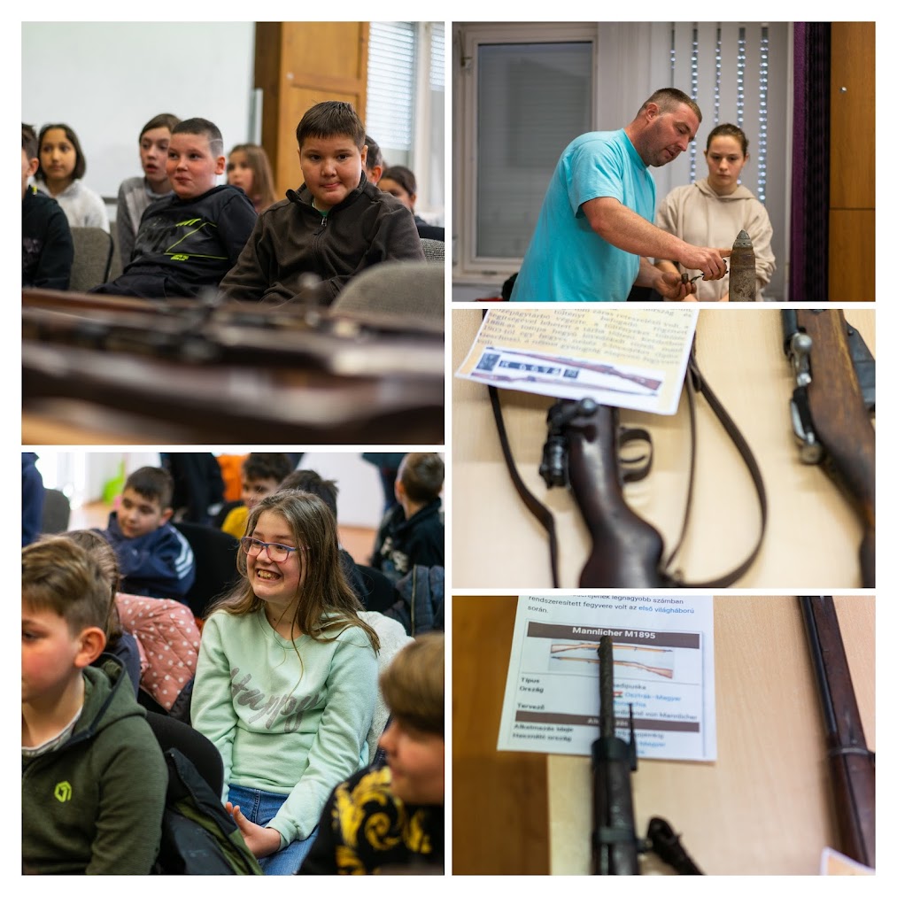 Március 29-én a 4. évfolyam rendhagyó órán vett részt. Galli Kálmán saját gyűjteményét hozta el nekünk. A gyerekek ismereteket szereztek az I. és II. világháborúban használt fegyverekről, kezükbe vehették a katonák egyéb használati tárgyaikat. Megcsodálhattak egy I. világháborús levelezőlapot, melyet a frontról írtak, rajta a monarchia pecsétjével. A puskákon kívül Kálmán bemutatott egy gyalogsági egy lovassági kardot illetve egy szép állapotban megmaradt közel 1000 éves kardot is. Az előadás végén a gyerekek örömmel vették kézbe a bemutatott tárgyakat.