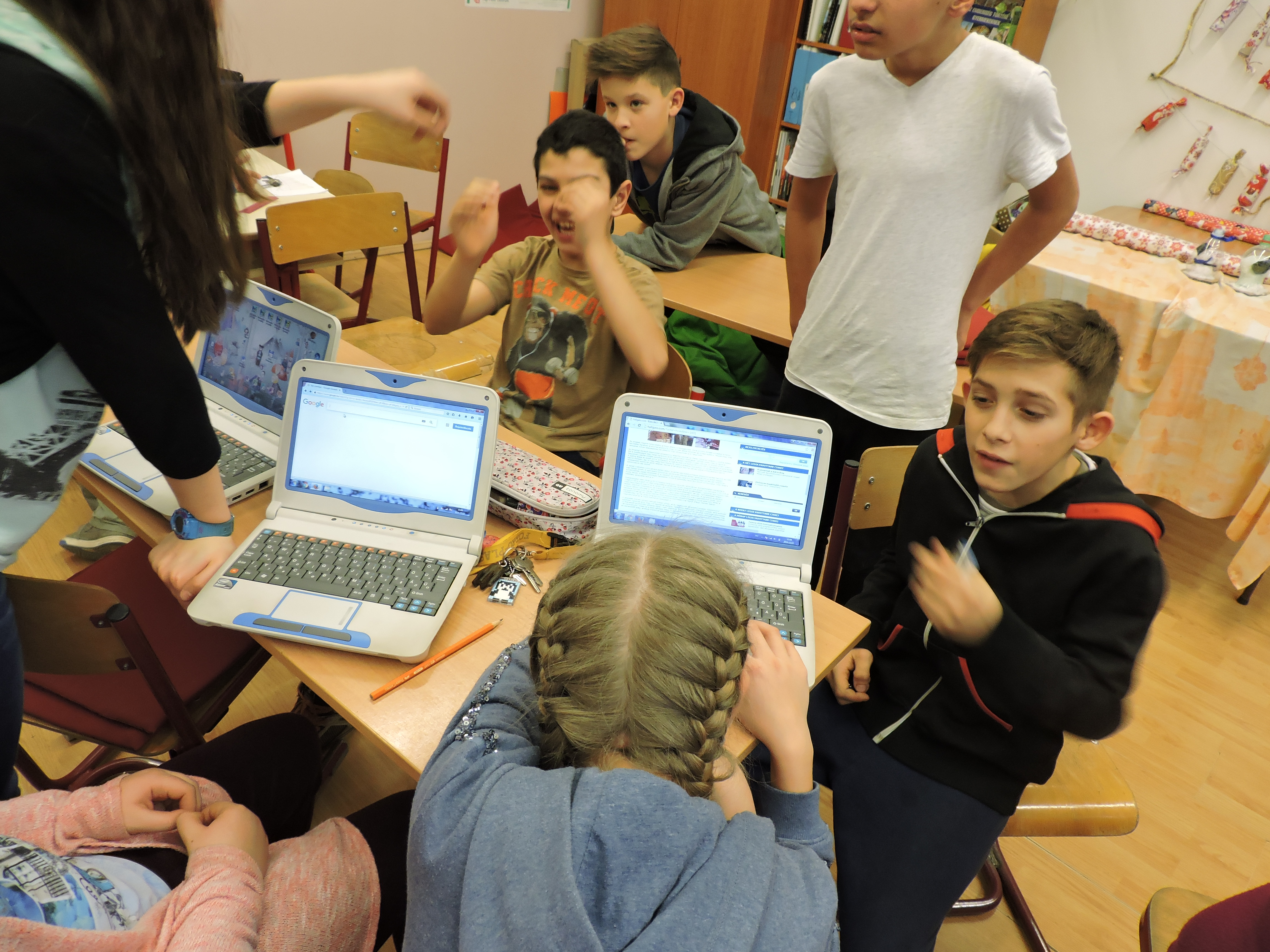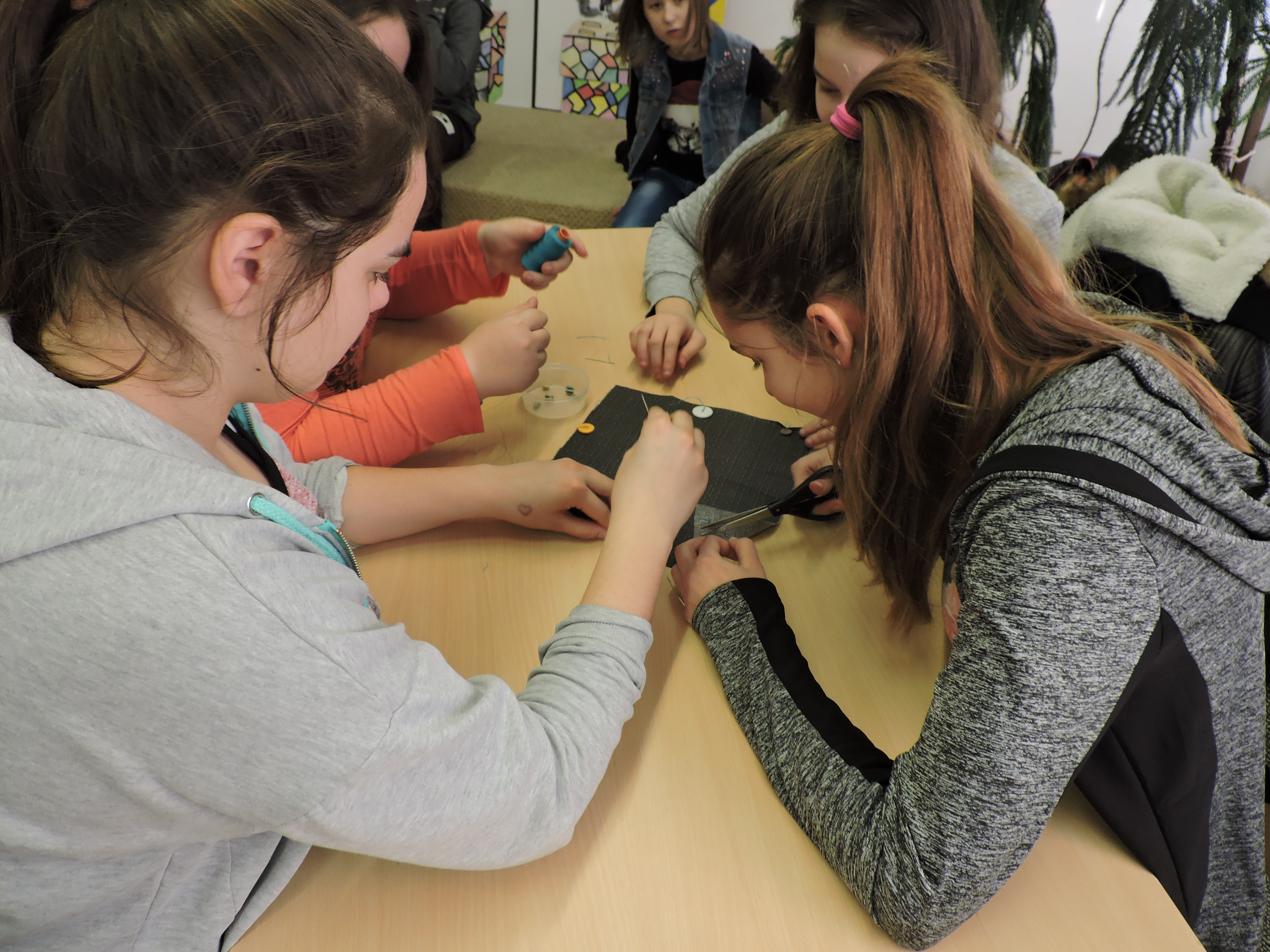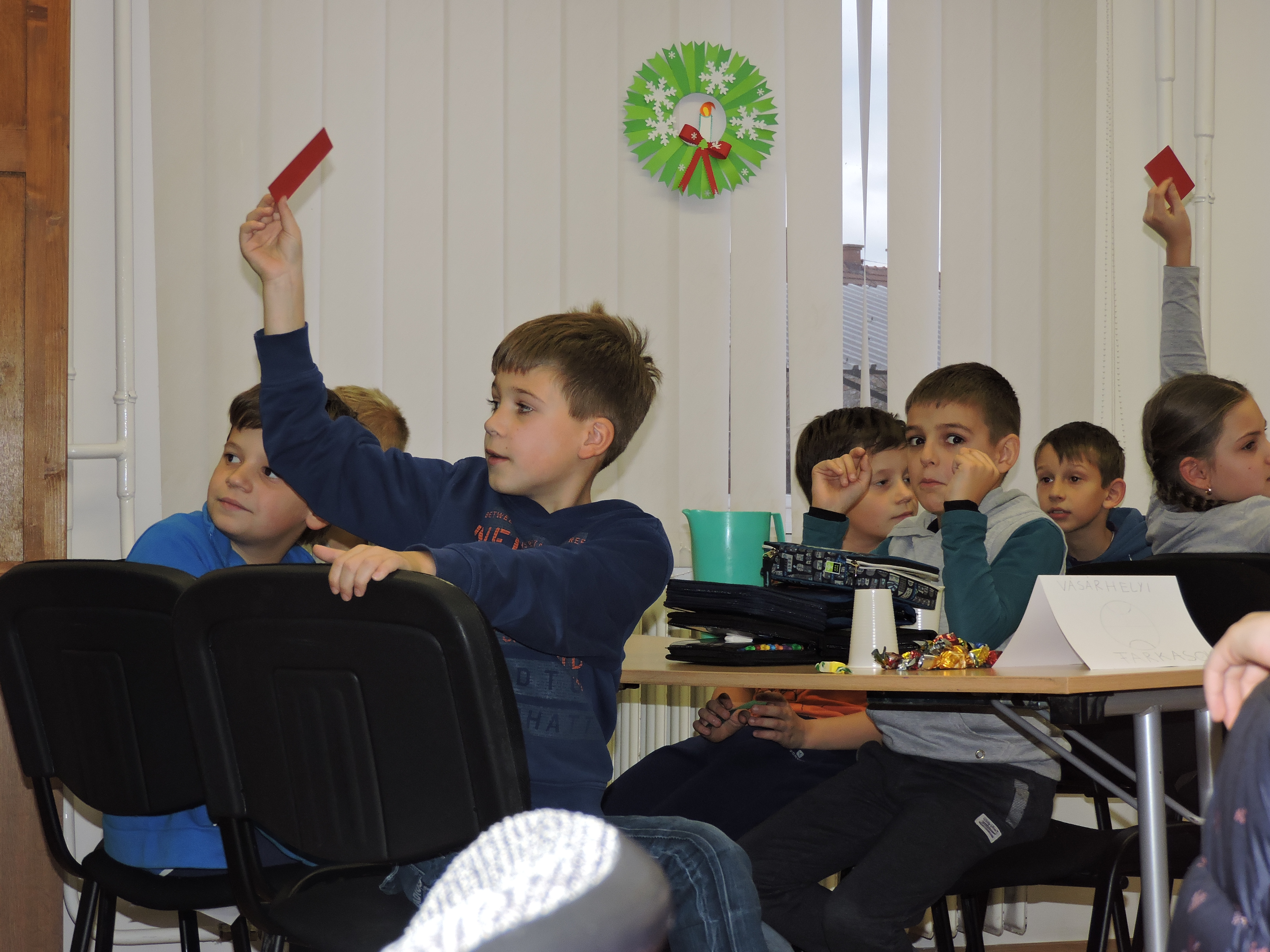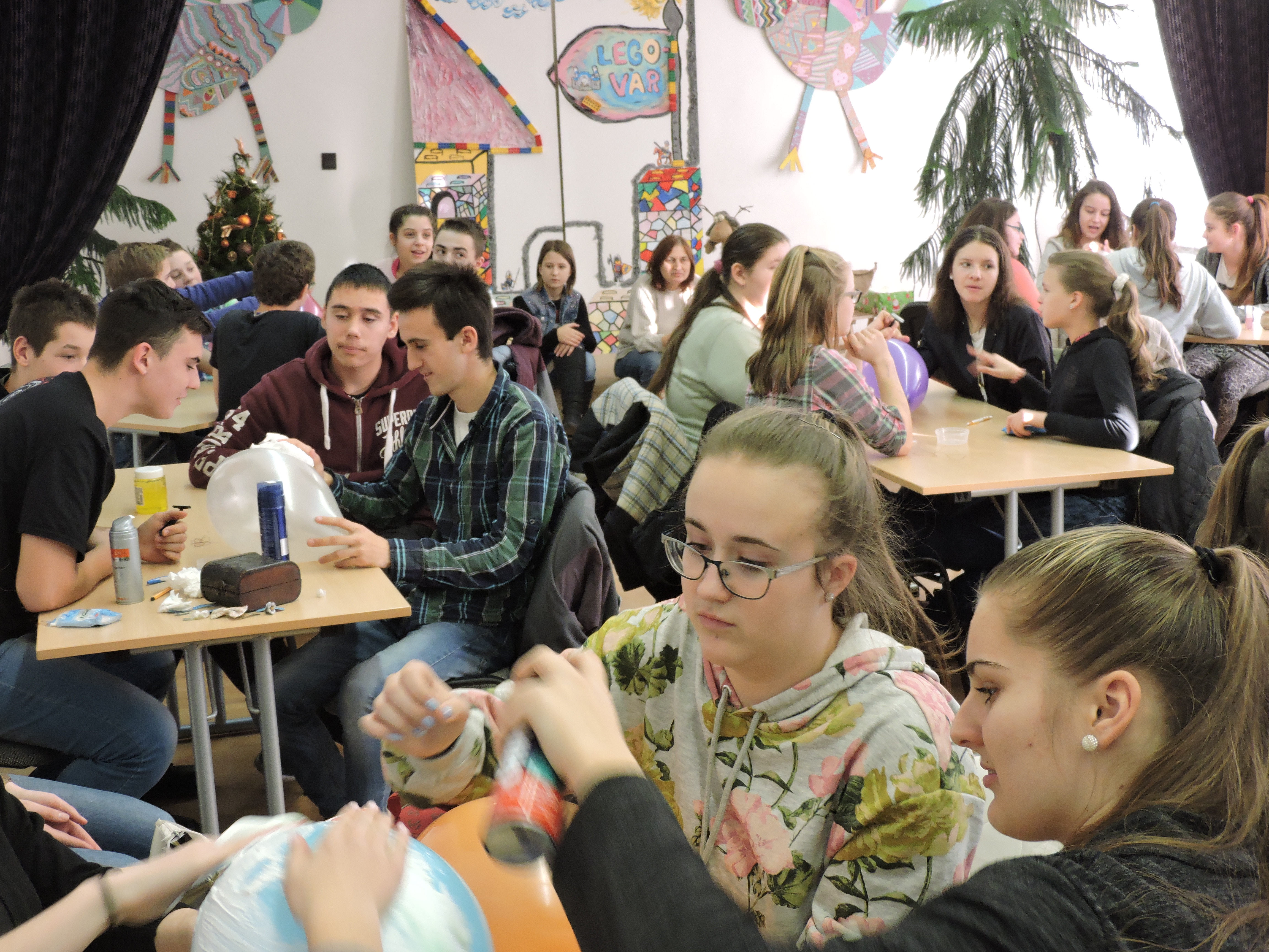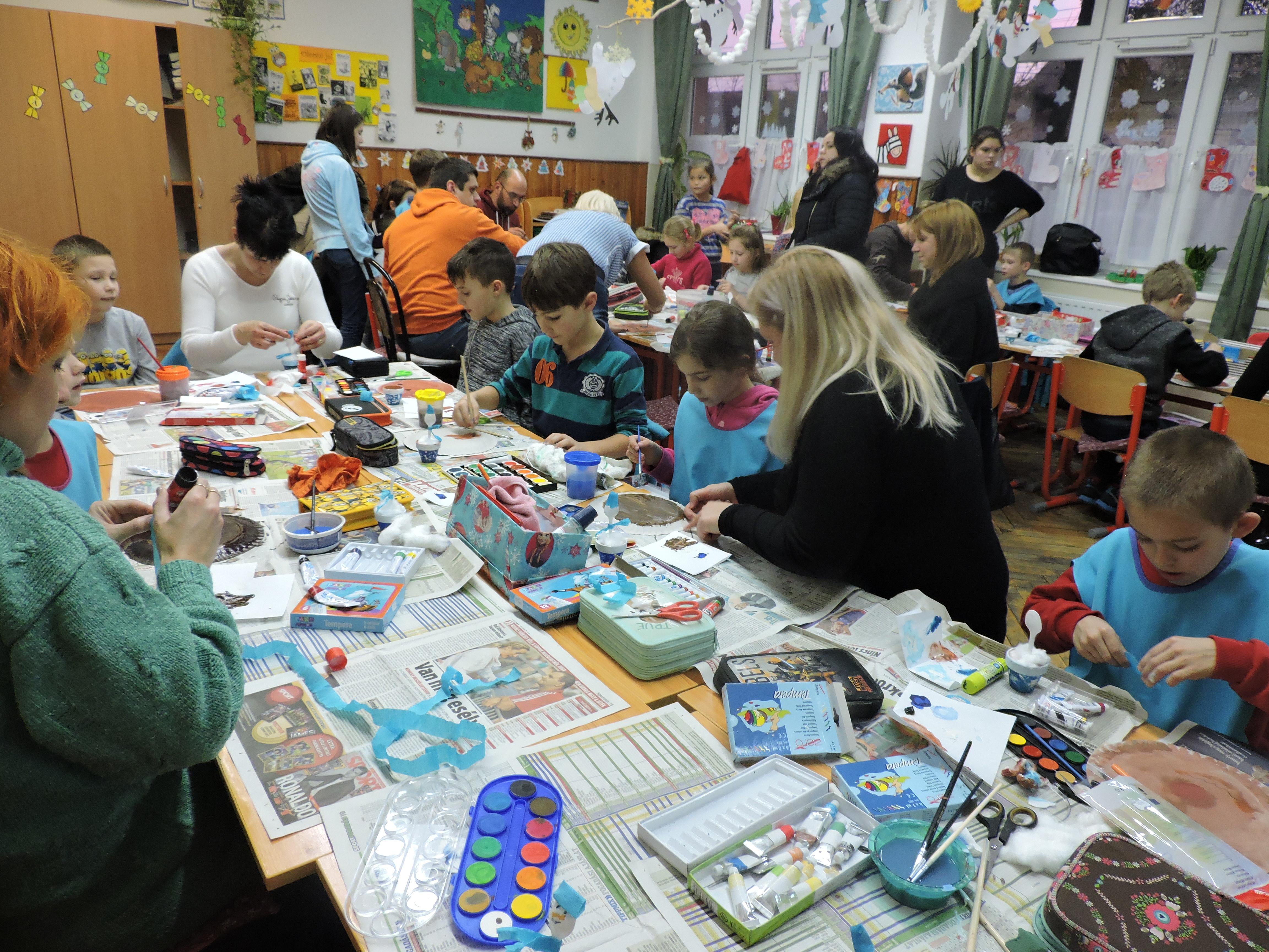 Délután sem maradtak program nélkül a tanulók, hiszen a legnagyobbak Pályaválasztási vetélkedőn tapasztalhatták meg a szakmák különbözőségeit. A gyerekek gombot varrtak, lufit borotváltak, szilveszteri sminket, frizurát készítettek és közben persze hangos nevetéssel töltötték meg a zsúfolásig megtelt ünnepi díszbe öltöztetett Játékházat.