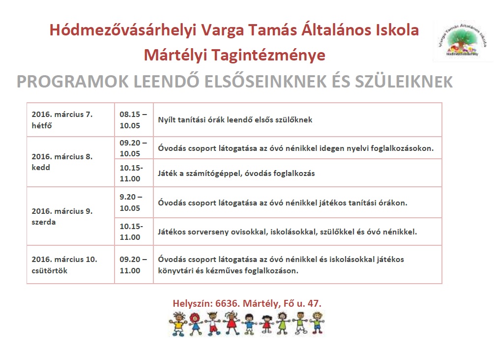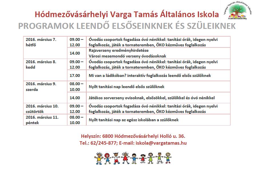 a Hódmezővásárhelyi Varga Tamás Általános Iskolában: 2016. március 8. 18 óra.