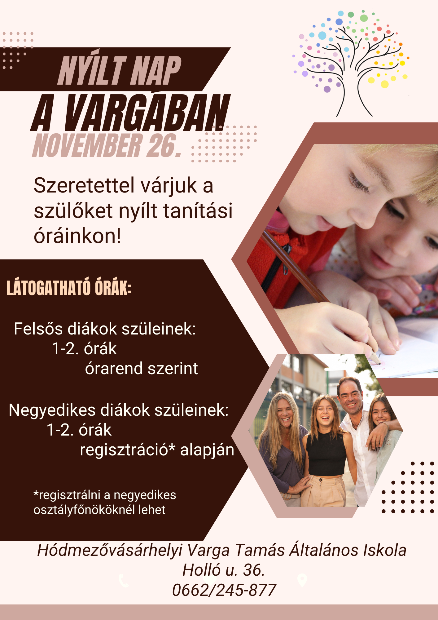 November 26-án, kedden nyílt órákat tartunk felső tagozaton tanulóink szüleinek, melyre szeretettel várjuk a negyedik évfolyamos tanulókat és szülőket. A negyedikeseknek előzetes regisztrációra van szükség a programon való részvételhez.