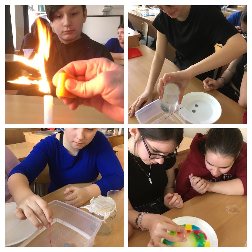 Március 23-án a 7.b osztály tanulói rendhagyó kémia-fizika órán vettek részt. Szabó László tanár úr irányításával érdekes, látványos kísérleteket végeztek.